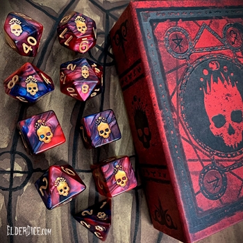 Each set of Elder Dice contains the complete set of nine polyhedral gaming dice: 1 four-sided die, 3 six-sided dice, 1 eight-sided die, 1 ten-sided die, 1 ten-sided percentile die, 1 twelve-sided die, and 1 twenty-sided die.