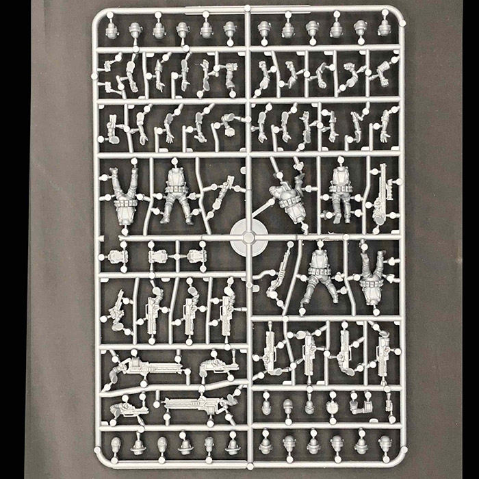 This box set includes enough parts to build 24 hard plastic soldiers that can be equipped with standard infantry rifles with underslung shotgun/grenade launcher, carbines, sniper rifle, pistols, shotgun, flame unit, and squad support weapons. Five headgear choices allow you to customize your forces.