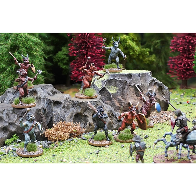 This hard plastic box set allows you to build up to 24 35mm tall Satyr Brutes equipped with a variety of one-handed and two-handed weapons and accessories with different head types, tails, and shields.