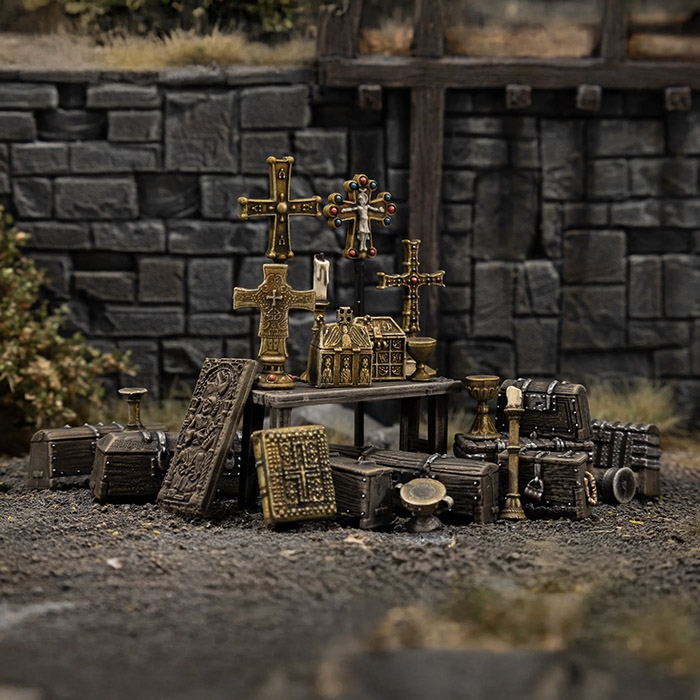 Enrich your Dark Age and Medieval games (including Pillage of course) with this beautiful collection of treasure pieces and lootable objects. This set includes an assortment of chests, caskets, religious items and decorative artefacts ideal for scenario objectives, tabletop dressing, or narrative play.