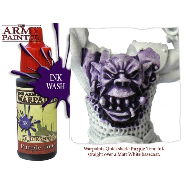 The Quickshade Purple Tone Ink is loaded with deep Purple and heavier dark pigment in the popular Warpaints ink resin base. Use on top of white for an instant purple toned and shaded miniature or on top of purple, red or blue for extra depth and shading. Check the Barbarian flesh example in this entry. As all the Quickshade Inks, it looks stunning on a metal primer for that Slaaneshi look. Shading and colour toning in one wash.