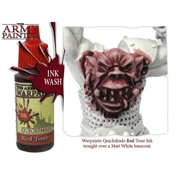 The Quickshade Red Tone Ink is loaded with red and heavy black pigment in the popular Warpaints ink resin base. Use on top of white for an instant red toned and shaded miniature or on top of yellow, orange or red colours for extra depth and shading. As all the Quickshade Inks, it looks stunning on a metal primer, giving it an evil Khorne look. Shading and colour toning in one wash.